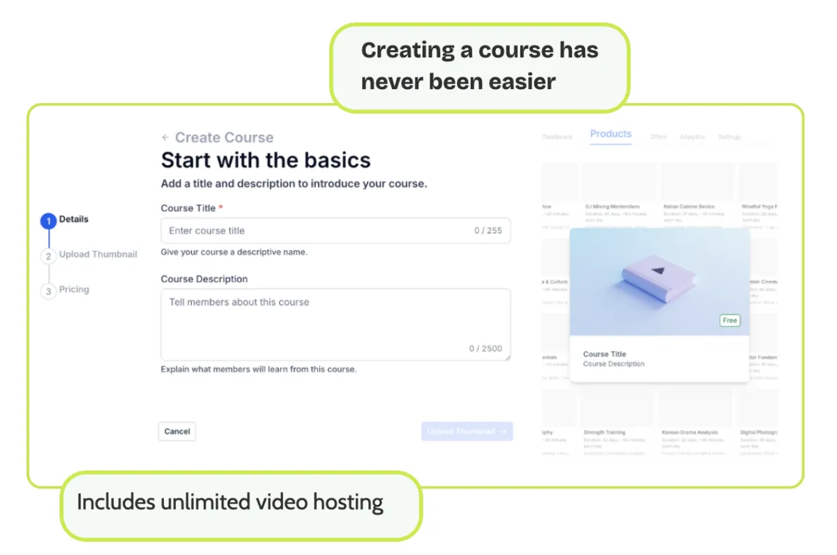Create unlimited courses and communities with drip content and gated access.