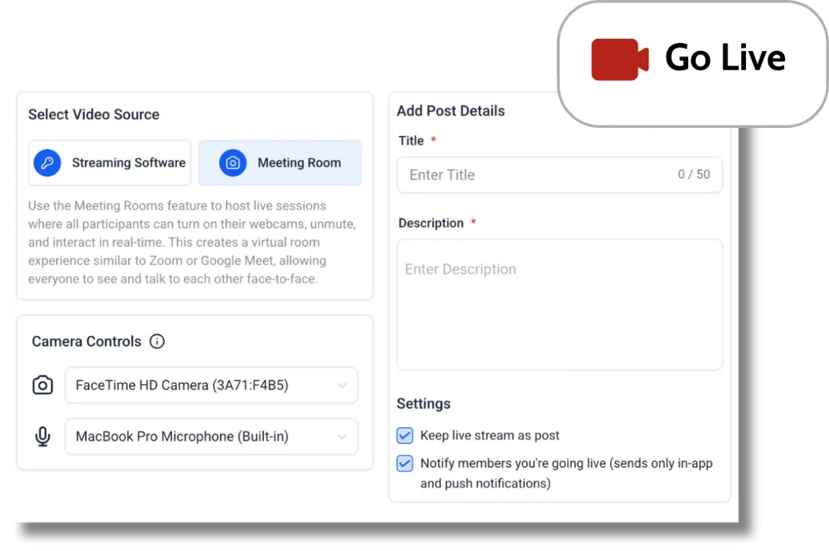 Go Live lets you host workshops, client calls or Q&As directly inside your community.