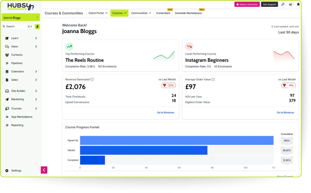 Hubsy shows you exactly how your offers are performing — from enrolments and completion rates to total revenue and upsell conversions.