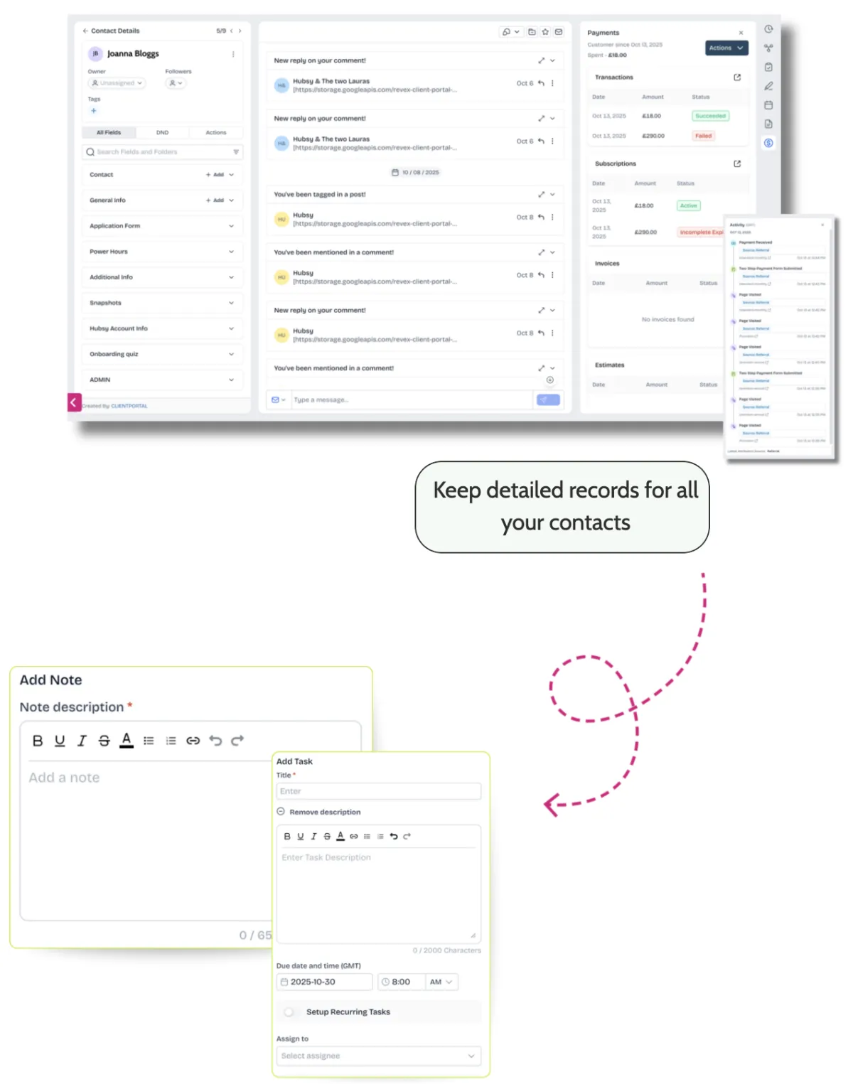 Keep every client and lead organised in one place with personalised profiles, notes, and timelines that show every message, payment, and related task.