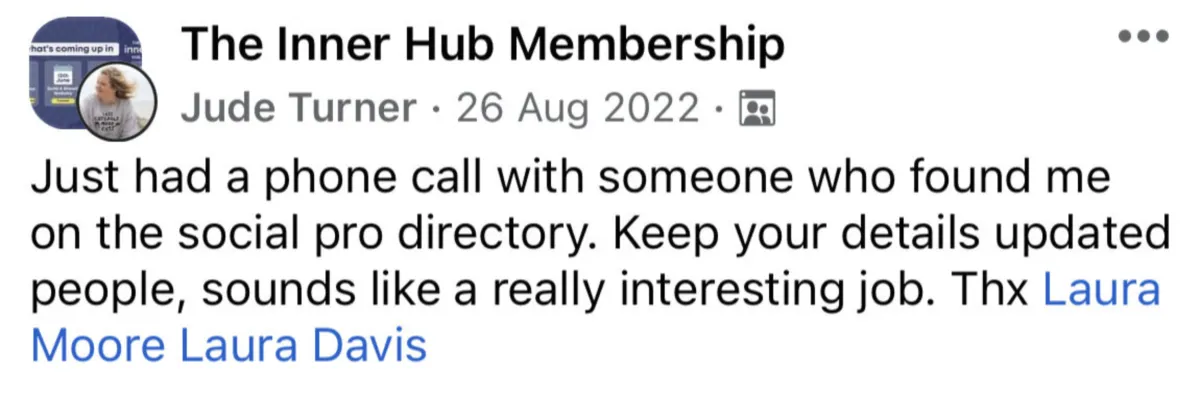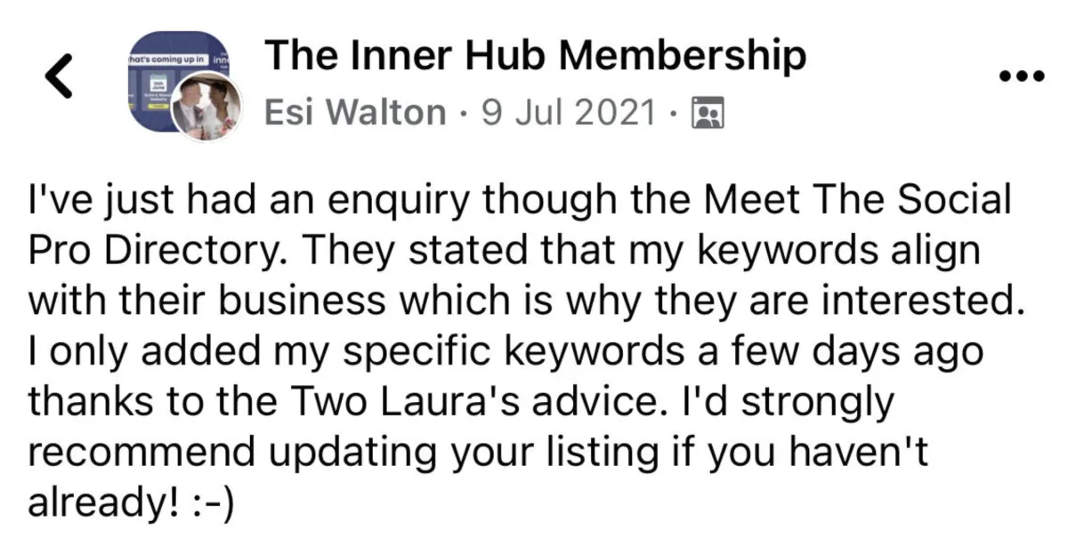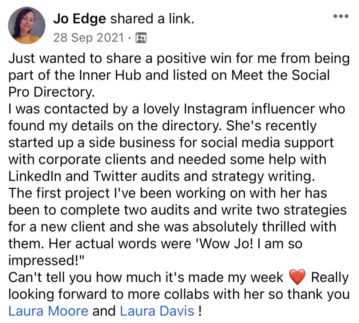“The Inner Hub has paid off tenfold. I'm now earning more than twice what I was in my employed role before I went freelance. It's not been a huge effort to get those clients in because of the structure learned from the Two Lauras in the Hub.
