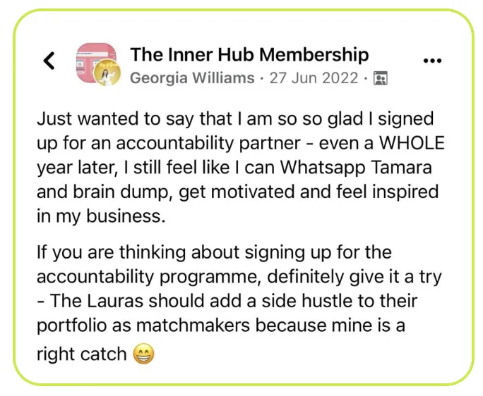 “It's given me the confidence to talk about social media with much more authority, to raise my hourly rate and to be bolder in charging more. The Inner Hub has made a hugely positive impact on my mindset and my business.”