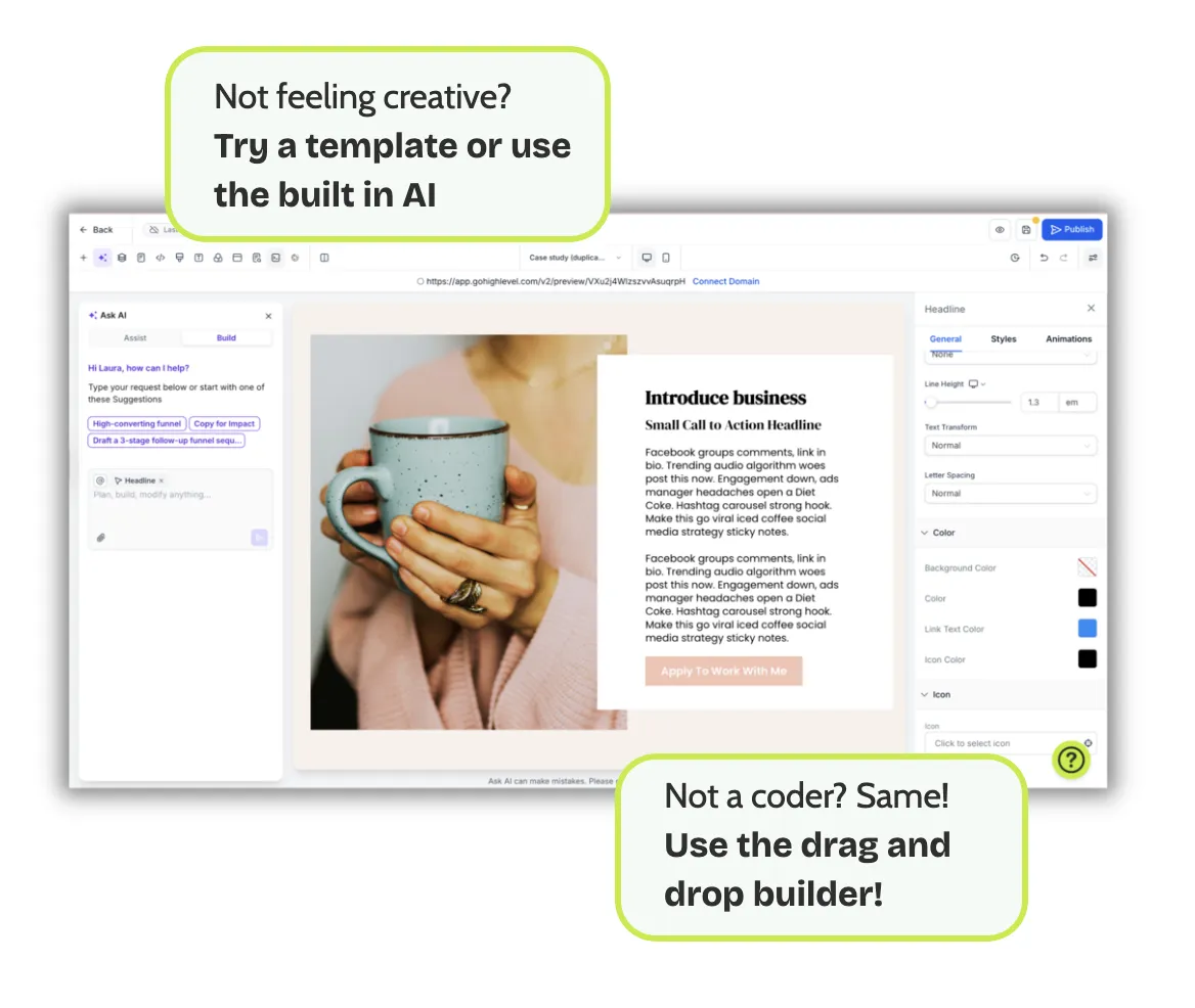 No coding or tech skills needed. Use our simple drag and drop builder to create a professional website that works perfectly and looks like you’ve paid a designer a small fortune.