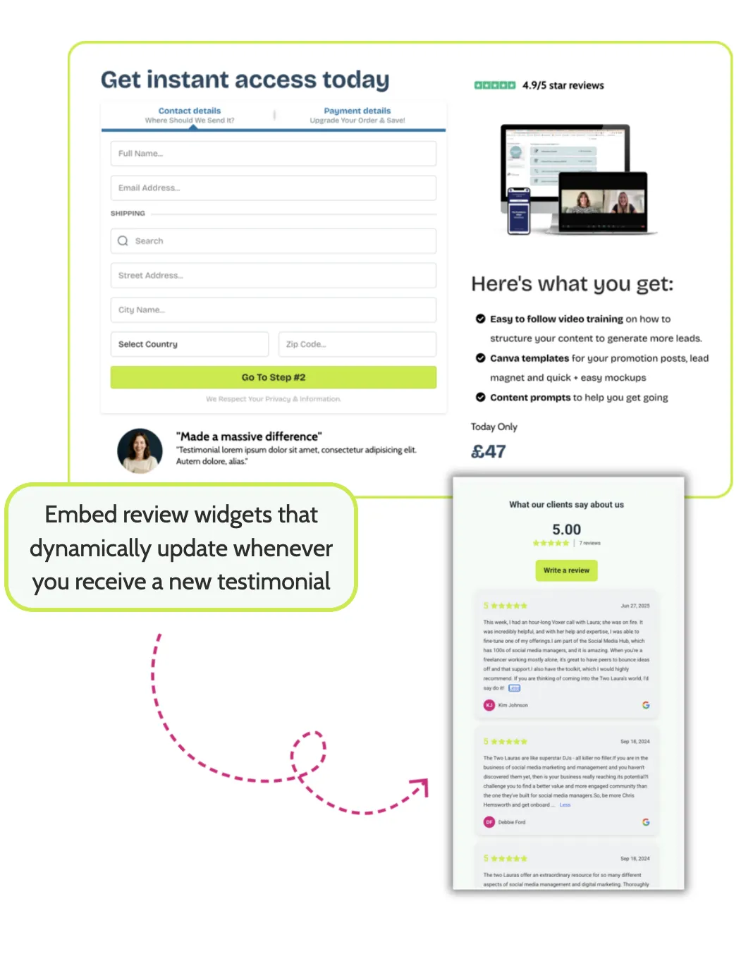 You can even boost conversions by adding order bumps, one-click upsells, and dynamic client reviews that update automatically across your pages.